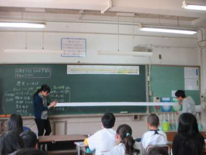 社会科の学習が始まりました。今日は「歴史」から思いつく人物や出来事などをみんなで交流しました。授業の終わりには,歴史の長さをテープに置き換えて子どもたちに伝えました。これからどんな学習が始まるのか楽しみです。