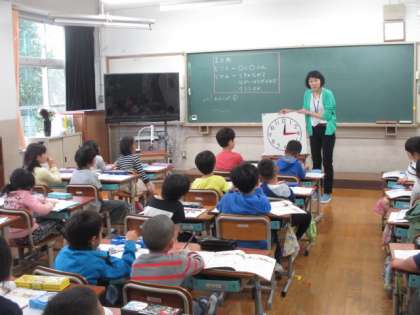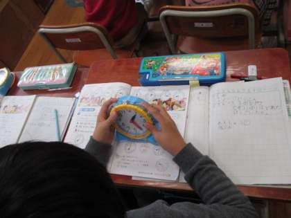 時計の学習が始まりました。模型を使って,何時何分という時刻をつくって,1年生の時より詳しい時刻を読めるようになりました。また,朝起きてから家を出るまでの時間を考えました。時間は,時刻と時刻の間を表すんだということを学びました。
