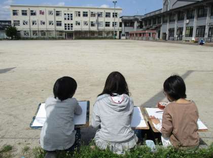 さっそく校庭に出て校舎や木,花などをスケッチしました。