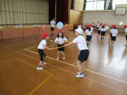 今日の体育の体ほぐしの運動では、風船を落とさないように協力して行いました。自然と声を掛け合って、今日も協力できて、いい笑顔がたくさん見られました。