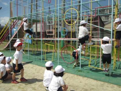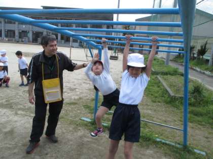 校庭の遊具の使い方を体育で学習しました。うんていや総合遊具は子どもたちに人気の遊具なので,子どもたちは待ち遠しくしていたことでしょう。「うんていの上には立ちません」「総合遊具では競争はしません」など,使い方のルールをしっかり聞いて,楽しく遊びました。