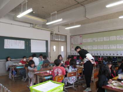 今日,給食時間中に栄養教諭の先生が来てくれました。みんな嬉しそうにたくさん話しかけていました。