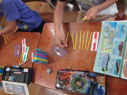 今日は「17たす3の計算の仕方を考えよう」というめあてでした。1年生のくり上がりのあるたし算から少し発展してきました。数え棒を使って,実際に操作しながら計算の仕方を確認していきました。