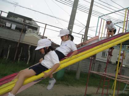 午前中,少し天気が怪しかったのですが,体育で遊具の使い方の学習の仕上げをしました。先週初めて3階まで登ったときは,怖そうにしていた子どもたちも,だんだん慣れてきた様子で,今日はすいすい登っていく子が多かったです。