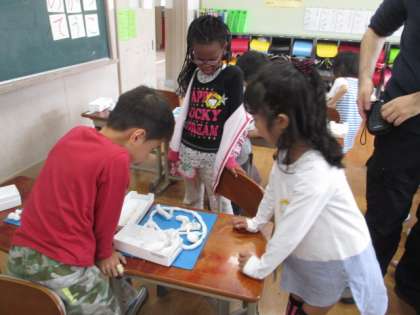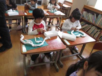 今日は「ひもひもねんど2」をしました。ねんどの出し方やしまい方,使い方にも少し慣れてきて,自分たちでどんどん作っていきました。最後に何を作ったか自分の作品を発表して,友だちの作品を見て回りました。「〜くんのドラゴンがかっこよかったです。」と気に入った作品のことを発表していました。