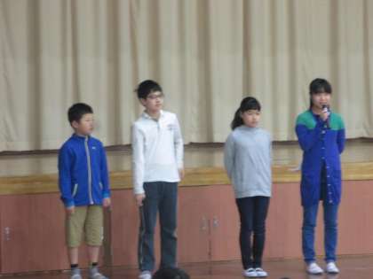 今年度前期の児童会代表が決まりました。初めて全校の前に立つので,少し緊張した様子も見られましたが,5月の児童会目標を発表しました。今回のことをいい経験にしてほしいと思います。