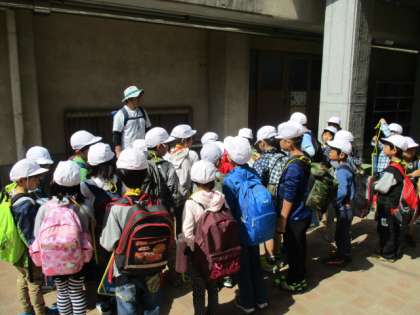 今日は、昨日のあやしい天気と違って、雲ひとつない晴れた天気で遠足日和でした。遠足によいよ出発です。「大文字山まで、頑張って歩くぞー!」の掛け声で出発しました。