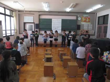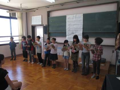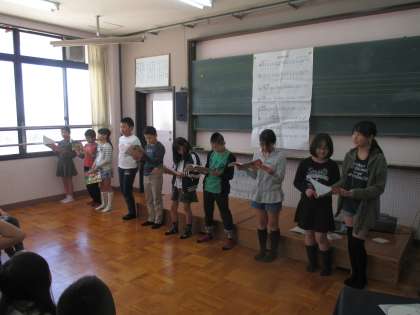 音楽の時間です。グループに分かれ,歌を歌いました。練習からグループで行い,意見を出し合い,ぶつかり合いながら,練習を重ねました。友だち同士で学びあいながら,力を高めていってほしいです。