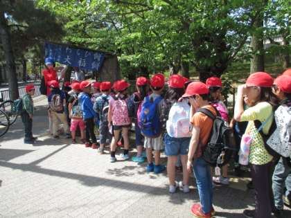 みんなの待ちかねていた遠足に出発!五月晴れとは今日の日のような日のことですね。澄み渡った青空に新緑がまぶしい季節です。学校を出発して,東大路を南へ歩き,平安神宮の前を通ったら,もう動物園はすぐ近く。みんな,2列にならんで行儀よく歩いていきました。