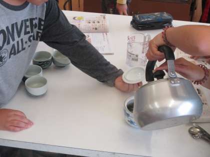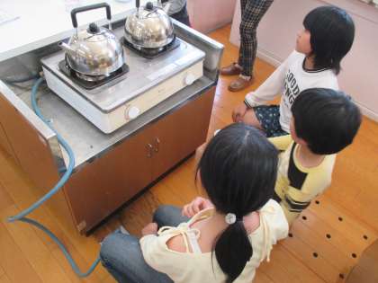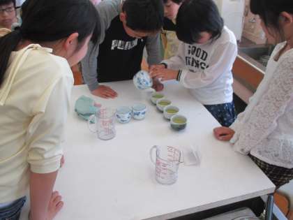 今日は,みんなでお茶を飲みました。お茶を飲むために,まずはコンロでお湯をわかします。火のつけかたの勉強です。ふっとうしたら,急須にお湯を注ぎ,湯飲みに移します。濃さが均等になるように,入れることができました。ほっこりしたひと時でした。