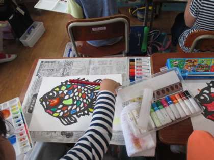 「にじいろの魚」完成!用具の出し入れや水を汲みに行くのも大分慣れてきて,手早く準備ができるようになってきました。水彩絵の具ならではの透明感のあるきれいな色を経験できたことと思います。一匹ずつとても個性的なすてきな魚ができました。