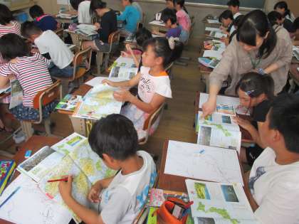 日本は,どんな地形なのか考えました。地図帳で調べてみると,茶色の部分が多く,人間で言うと,背骨のように連なっています。○○山脈といった名前がそれぞれついています。これから覚えていかなければいけません。