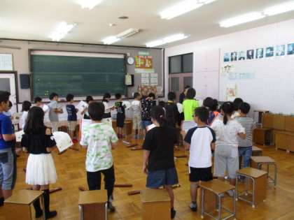 音楽の時間では、歌やリコーダーを練習する際に音楽室のイスを円にして学習しています。みんなの顔を見ながら学習できて,とても良い雰囲気です。