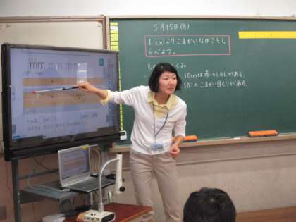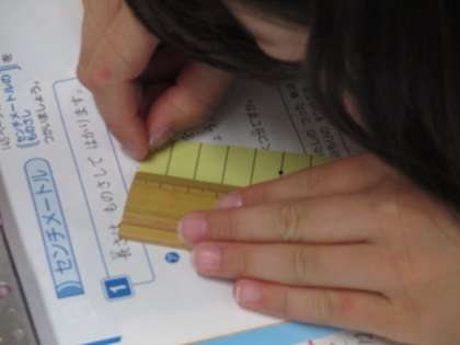 1cmより小さい単位の学習をしました。30センチものさしの小さな目盛を必死で数えて,10こあることに気づきました。これからは,1cmよりも小さな端数の長さも測ることができます。