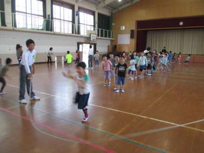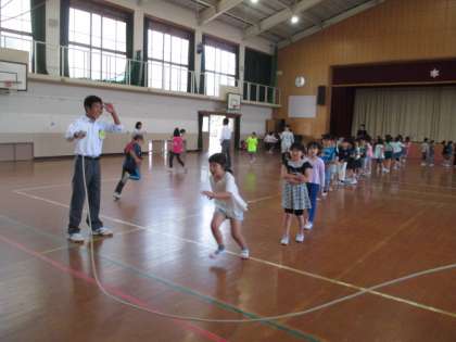 2年生は,前の人と間をあけずにどんどん入れるようになってきました。音楽がなっている間に何回跳べるかを,みんなで数えています。1回目のときは70回ほどでしたが,3回目の今日は108回跳べました。次回も記録更新を目指している2年生たちです。