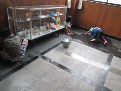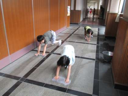 2年生になって,教室以外の場所もお掃除を担当するようになりました。生活科ルームの中や生活科ルームの周りの廊下,ランチルームです。生活科ルームの周りの廊下では「ピカピカ大作戦」を展開しています。すみっこまでしっかり拭き掃除をして頑張っています。