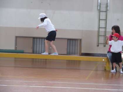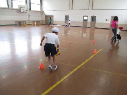 平均台やマット,跳び箱などいろんな運動ができるように組み合わせて,体育館を1周します。「足を前に!手を広げてバランスをとって!」「ジグザグドリブルはあわてずに!」みんないろいろな動きに一生懸命チャレンジしました。