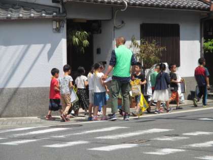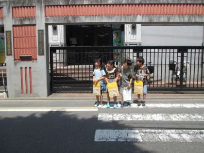 学校を出たところから,左右を確かめて横断歩道を渡ります。路側帯も意識して「はみでちゃ,あぶないよ」とお互いに声をかけていました。地域の交通安全協会やPTAのボランティアの方々に見守られて,歩いていきます。