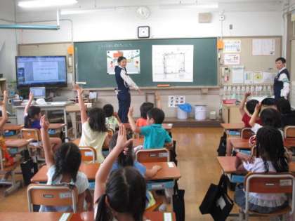 1年生は,初めての交通安全教室です。学校に入ると,登下校をはじめ子どもだけで行動することも徐々に増えていきます。下鴨署の方の「歩行者はどちらを歩けばよいですか?」の質問に「道の左!」と答える子も大勢いました。正解はもちろん「右側」ですね。交通ルールを一つ一つしっかり覚えていきました。