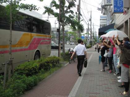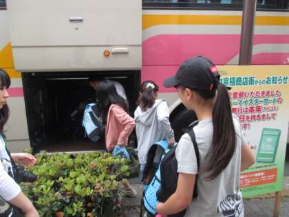 少し小雨のちらつく中,子どもたちはにこにこ元気に出発しました。「水族館がたのしみだね。」など話しながら行くと,東大路にはもうバスが待っていました。荷物を手際よく積み込んで,さあ出発です!