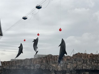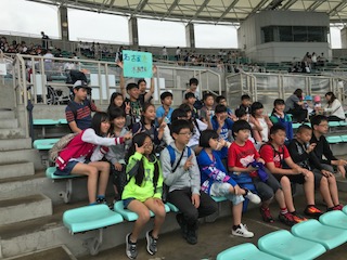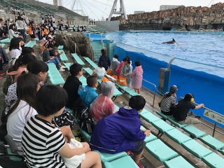 名古屋港水族館で昼食です。昼ご飯のお弁当を食べながら、イルカパフォーマンスを楽しみました。大満足の子どもたちです。