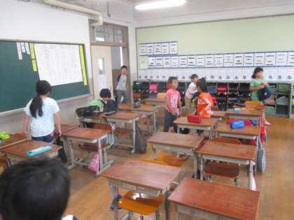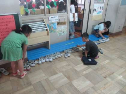 移動するときや上靴を脱ぐ時にはいつもその後に整理をしてくれる人がいます。この人たちによっていつもきれいな教室,履きやすい状態の上靴が保たれているんですね。「ありがとうございます。」