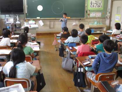 円の中心を算数の時間に学習しました。円の中心を色々な方法で探し,みんなの前に出て発表しました。そして,円の中心を通って,まわりからまわりまで引いた直線を円の直径ということも学習できました。円をかく学習がすきな児童が多いです。