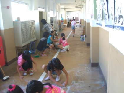 始めは,廊下手洗い場の掃除を分担した2人から始まり,「明日は,自分の掃除を早く終わらせて,手伝うわ。」と,いう声とともに,あっという間に人数が増え,前期終業式の大掃除では,全員が参加,各自の掃除を済ませ,3階教室前廊下に全員集合です。廊下のすみからすみまでをピカピカに磨き上げることができました。