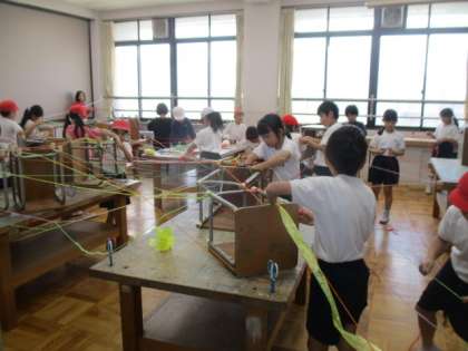 毛糸やスズランテープを張り巡らせて、図工室を自分たちの空間に仕上げました。