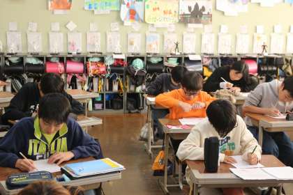 近寄って見てみると、躍動感のある図工の作品が少しずつ作られているところでした。静かに頑張る子どもたちと躍動感のある作品が静と動の対比の関係に見え、より一層映えて見えました。完成が楽しみです。ちなみにこれは 将来の自分を作品化しているようです。