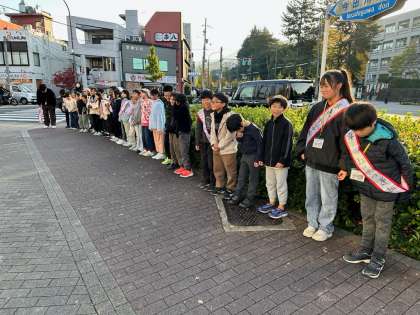今日は、児童会が企画した『マナーの達人スキルアップキャンペーン』の一つとして、3・4年生が百万遍の交差点に赴き、あいさつ運動を行いました。子どもたちは、その場所に着くなり、笑顔溢れる素敵な表情で、元気よく道行く方々に「おはようございます」とあいさつをしていました。子どもたちの元気のよいあいさつの声に、たくさんの方々が笑顔で挨拶を返してくれました。あいさつをしている時も、あいさつを返していただけた時も、子どもたちはとてもうれしそうな様子でした。わずかな時間ではありましたが、子どもたちがあいさつの素晴らしさを改めて感じることができた貴重な時間になりました。