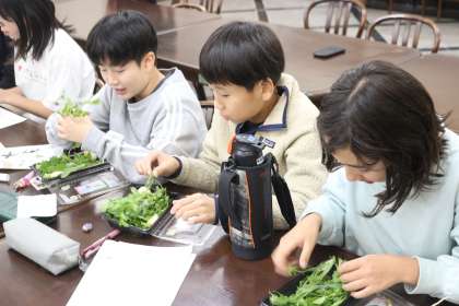 子どもたちはもう覚えているでしょうか。聞いたことはあるけれど見たことはない、食べたことがあるかわからないという子どもたちもいる中で、実際に七草を見せていただき、自分たちで資料を見ながらどれがどれかを判断していきました。なかなか難しいものです。