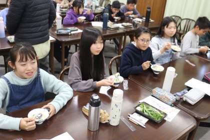 授業の中で、これはお腹がすくなとこっそり思っていた私でしたが、何と授業の後半に七草がゆを食べさせていただけることが分かりました。子どもたちだけでなく私もいただくことができたのです。子どもたちは、さっきまで見ていた七草を感じながら、味わって七草がゆをいただいていました。とても美味しかったです。何杯でも食べられそうでした。