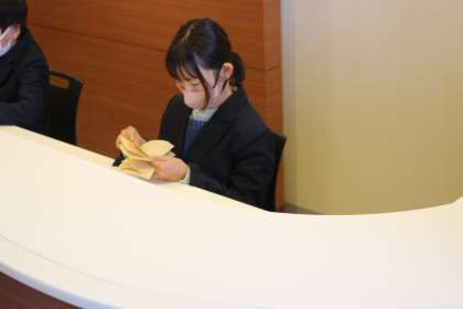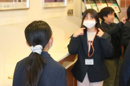 まずは京都銀行。最初はマナーから丁寧に教えていただきました。マナーの達人を目指している子どもたちからすると、一歩リードしていたのかもしれません。ただ、やはりお札の数え方など、初めて知ることも多かったようです。最初は緊張した面持ちで学んでいた子どもたちも、次第に個性が光り始めていました。お金を預けに来られたお客様に対応する子どもたちは、いつもより大きくさらに立派に見えました。