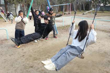 今日はテストを返した後に、子どもたちがしたいと言っていた、飛鳥井公園のブランコに行きました。