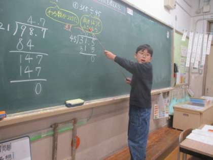 今日は、小数÷整数の学習で、「商が1より小さくなるときの筆算のしかた」や「わる数が2けたの時の筆算のしかた」について考えました。