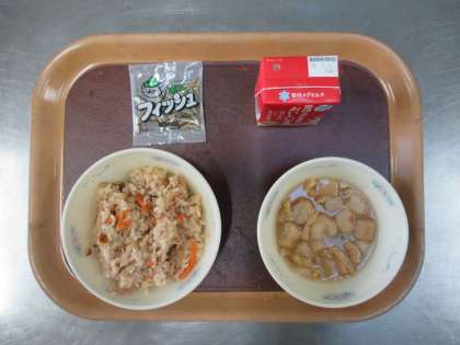 今日の給食は 炊き込み五目ごはん 牛乳 みそ汁 じゃこ です。