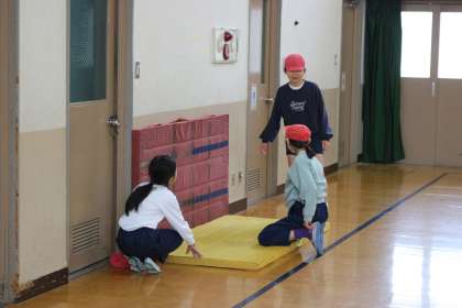 前回お伝えした時は、マット運動を始めたばかりの時でした。その後、場の工夫もされたところで練習を重ねることで、最初と比べて軽やかに動くことができるようになった子どもたち。さすがです。新しい技ができなかったとしても、できる技が磨かれていました。