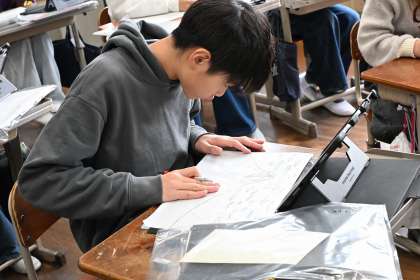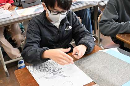 図画工作科では「版画」の学習が始まりました。今年の版画のテーマは版画だけに「浮世絵」です。子どもたちは社会科の歴史の学習の中で、江戸時代に「浮世絵」という文化が生まれてきたことを知っています。ただ、実際にその絵を彫って、刷るとなると話は別。今は彫るための下書きに挑戦中です。「先生、細かすぎます!」「こんなんかけません。」と悪戦苦闘しながらも、必死にかき進めています。