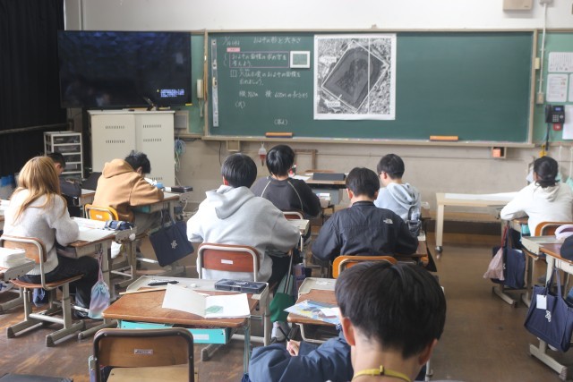 今回は、およその形とその大きさの学習で、大仙古墳のおよその大きさを求めるにはどうしたらよいか考えてみました。周囲の池の部分を含めて考えると、長方形でも円でもありません。独特な形として考えてしまうと、求め方がわかりません。そうなると、やはり既習の公式を生かすことが大切になってきます。今回は長方形に見立てて考えてみました。するともちろん簡単に求めることができます。“自分が求められる形に見立てる”というのがミソですね。子どもたちも納得した様子でした。