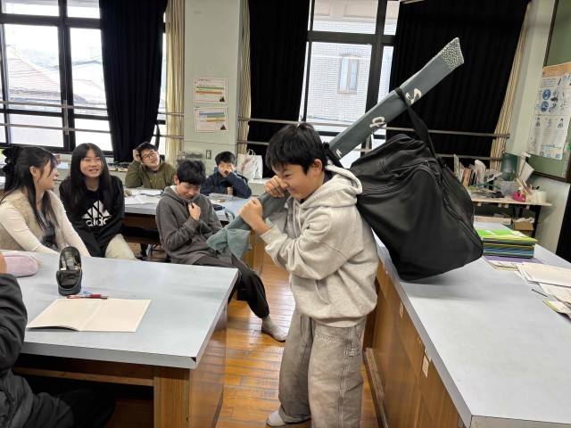 純粋なてこではないですが、その原理を生かした昔の私の荷物の持ち方について考えてもらいました。剣道の防具はとても重たいです。もろもろ入れると10kgほどあります。それを竹刀と防具袋を使って軽く持ちたい。みなさんならどう持ちますか?と尋ねてみると、頭を含めた3点で保持するという意見や、ランドセルのように背負う、竹刀をかばんにひっかけて写真のように持つというアイディアが出ました。どの持ち方も試してもらいましたが、一番軽く持つことができたのは、写真の持ち方でした。それとてこの考え方をつなげてみると…子どもたちから「なるほど!」「たしかに!」の声がたくさん挙がりました。