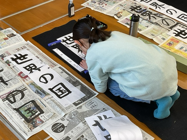 今日は、書き初めとして普段とは違う画仙紙に、「世界の国」という字を書いていきました。画仙紙になっても、やることは変わりません。字の特徴をとらえたり、ポイントをそれぞれ確認したりして、共有し、実践しました。とはいえ、やはり普段とは違って床で、大きな下敷きをひいて書くのは緊張したようで、いつもよりさらに緊張感が伝わってきました。ただ、細かいところまで事前に見抜いているからこそ、自分が書く時に工夫することができていました。書く中で、首をかしげたり、バランスを考えるために一度止まったり、眉間にしわを寄せたりしながら子どもたちは一生懸命書き初めに取り組んでいました。完成した後の、「この部分が上手く書けました!」という笑顔の報告もとても気持ちが良かったです。