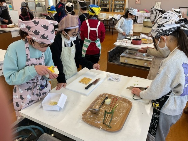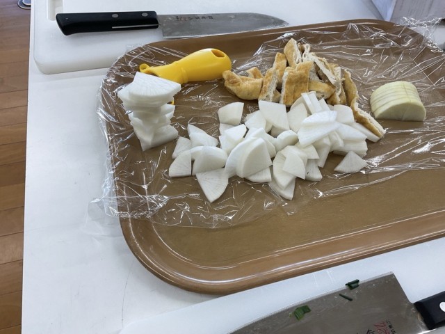 野菜を切る大きさなどは、普段のご家庭での料理が参考にされているようで、「え?大きい?うちではこれくらいやで。」「いやうちのはもっと大きいよ!」と会話しながら調理していました。最終的にその班では、両者の意見が加味され、大きさのまちまちなねぎが味噌汁に入れられていました。背景を知ると微笑ましいですね。真剣に調理をしていく子どもたち、真面目で一生懸命でした。しかし私は遊び心を見逃しません。どの班もつっこみを待っているような姿も見られ、私としてはとても楽しかったです。「大根は1人17個だよ!全部で68個だから。」算数的な要素もありました。温かい気持ちいさせていただくとともに、空腹も限界間近になりました。