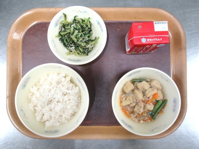 今日の給食は 麦ごはん 牛乳 高野どうふのそぼろ煮 だいこん葉とじゃこのいためもの です。