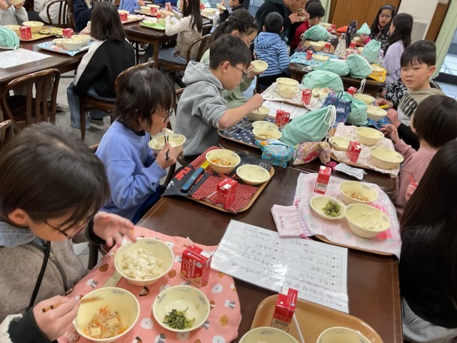 今日は2年生、4年生、えのき学級で給食を一緒に食べました。