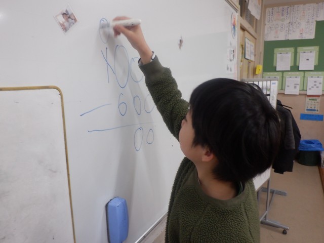 算数で「お買い物をしよう」の学習をしました。買い物を通して、ホワイトボードを使って筆算をしたり、合計がわかりやすくなるように値札を並べたりするなど工夫する姿が見られました。正しく計算するために、筆算やレジの操作も慎重に取り組みました。「おすすめは〇〇ですよ」と店員さんの声かけにも工夫がありました。間違えずに計算できたことも自信になりました!