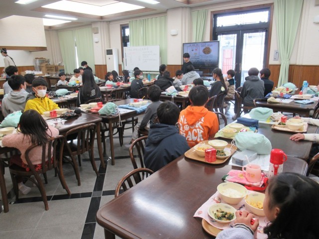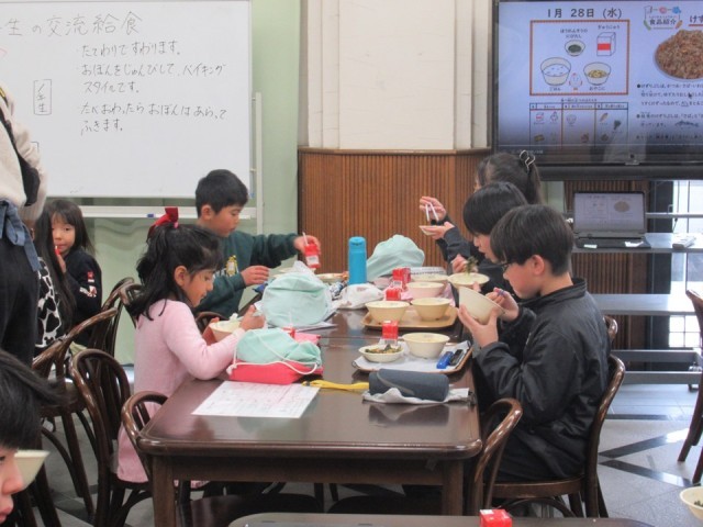 今日は、1年生と6年生がランチルームで交流給食を行いました。