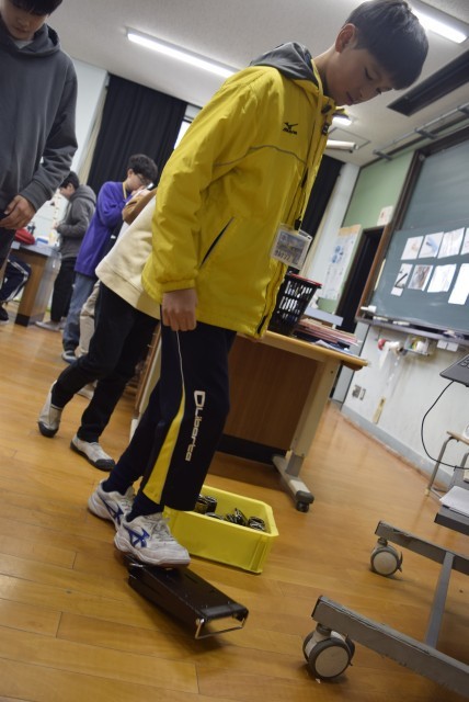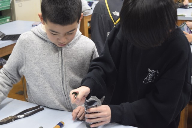話がそれてしまいました。せっかくなので、今回はそれぞれの支点、力点、作用点を考えながら、イメージのつかない道具は実際に使ってみてグループで話し合いました。「缶切りは支点と作用点が近いからわかりにくいです…」実際に使ってみたから言える言葉ですね。私物の空き缶つぶし器も用意し、つぶし体験もしてもらいました。単純な仕組みではありますが、つぶしにくいスチール缶ですら一瞬でぺちゃんこです。子どもたちは「おー!」と言いながら缶をつぶしていました。あまりに楽しかったようで、もう少し空き缶の補充が必要なようです。