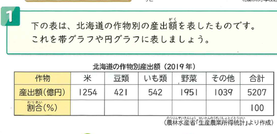 さて、今回は割合の円グラフ・帯グラフはどのようにかくのかというものでした。「北海道の作物別の産出額」を表したものをもとにして考えました。しかしこのままでは、割合になっていないので、グラフ化することができません。それぞれ割合を求める必要があります。例えば「米」でいうと、くらべる量➗もとにする量なので、125400000000➗520700000000です。おかしくなりそうですね。だから億でくくられ、1254(億)➗5207(億)とすることができます。はかせです。これは割り算の性質です。かけ算だと「0をおいておき、あとから0をつける」のようなことをするので、その違いが混ざって混乱する場合があります。「なぜそうなるのか」までしっかり覚えておくことが大切ですね。