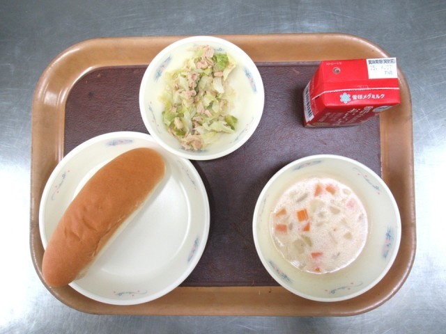 今日の給食は コッペパン(国内産小麦100%) 牛乳 ツナサンド(フレンチ味) 白いんげん豆のチャウダー です。